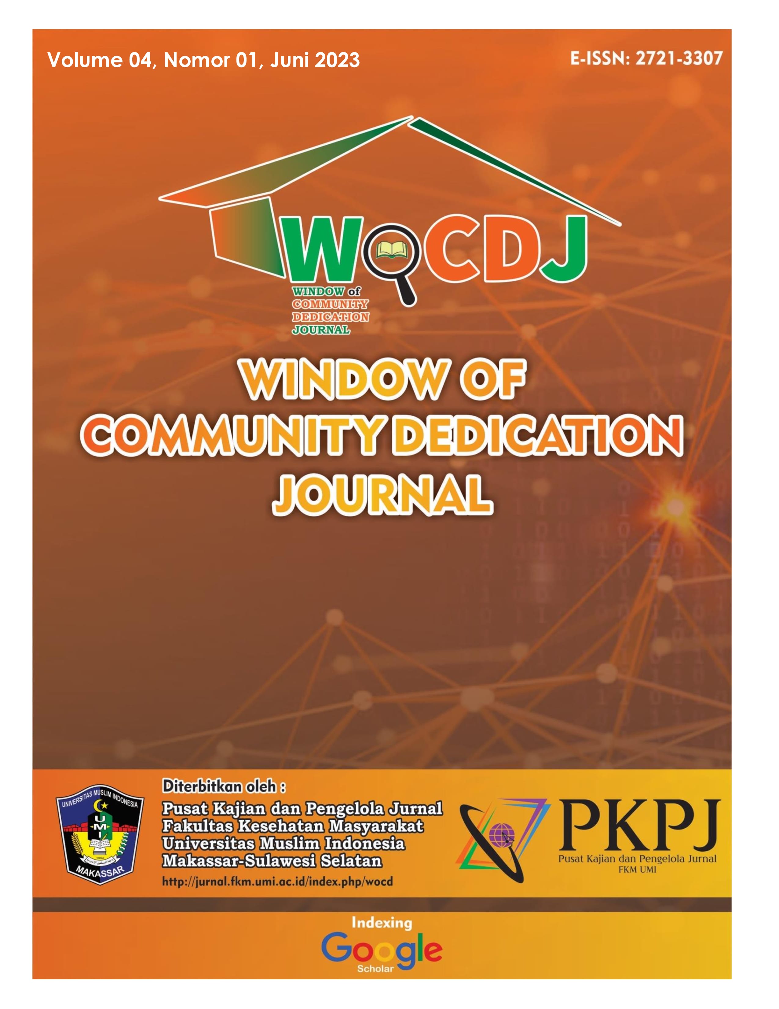 Window of Community Dedication Journal Merupakan Jurnal Ilmiah yang dikelola oleh Pusat Kajian dan Pengelola Jurnal Fakultas Kesehatan Masyarakat Universitas Muslim Indonesia dengan proses peer review, memiliki ISSN: 2721 - 3307. Menerbitkan artikel kegiatan pengabdian pada masyarakat bidang Kesehatan, Pendidikan, Sosial, Pengembangan Sumberdaya Manusia, Teknologi Tepat Guna, Pertanian dan Hukum.